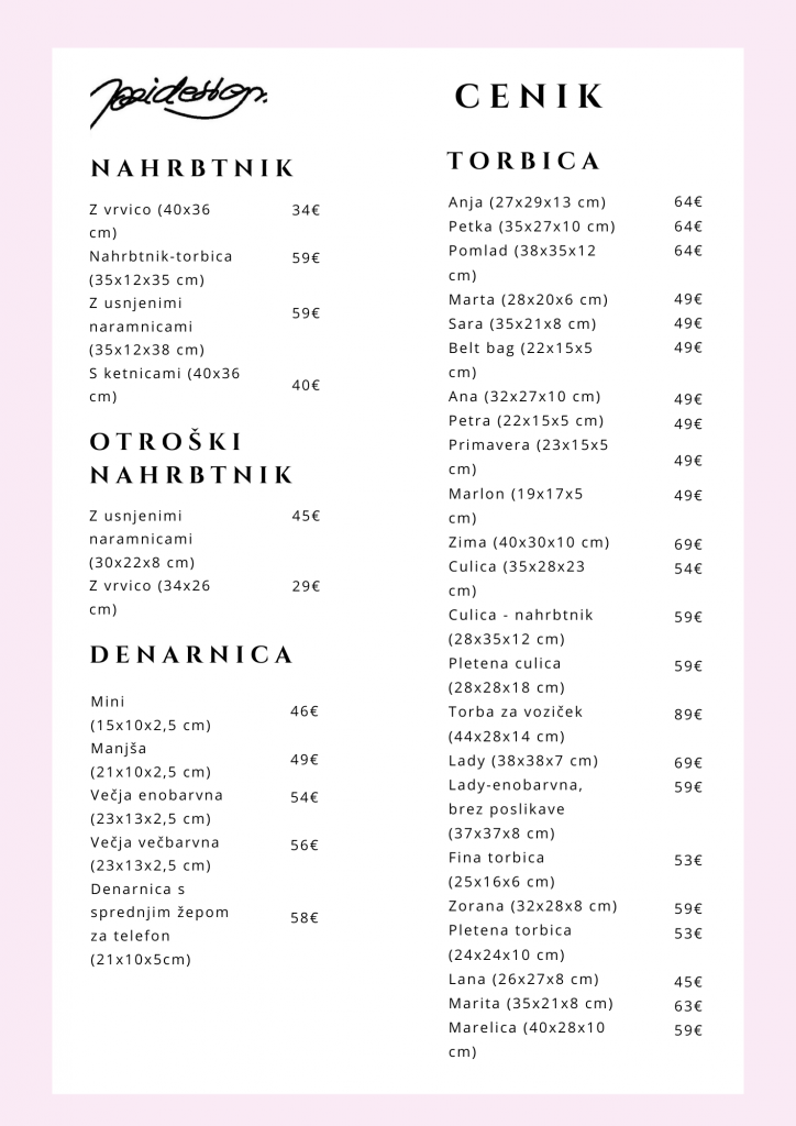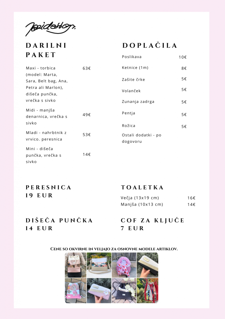 Cene so okvirne in veljajo za osnovne modele artiklov v albumih na Facebook strani Jozidesign in strani vsi izdelki.