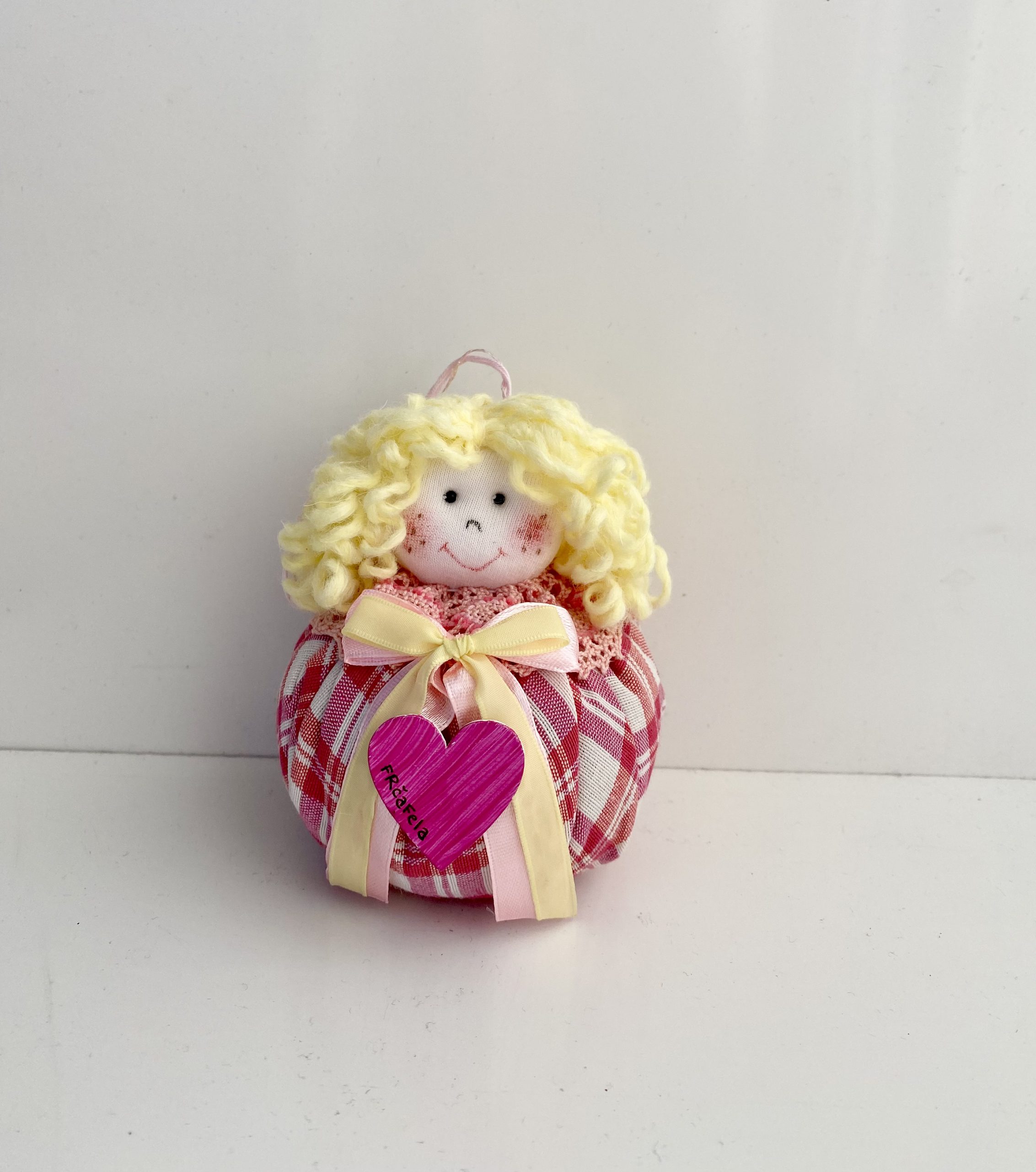 Velikost punčke je 10 cm, v celoti ročno izdelana in polnjena z aromatično sivko iz domačega vrta.