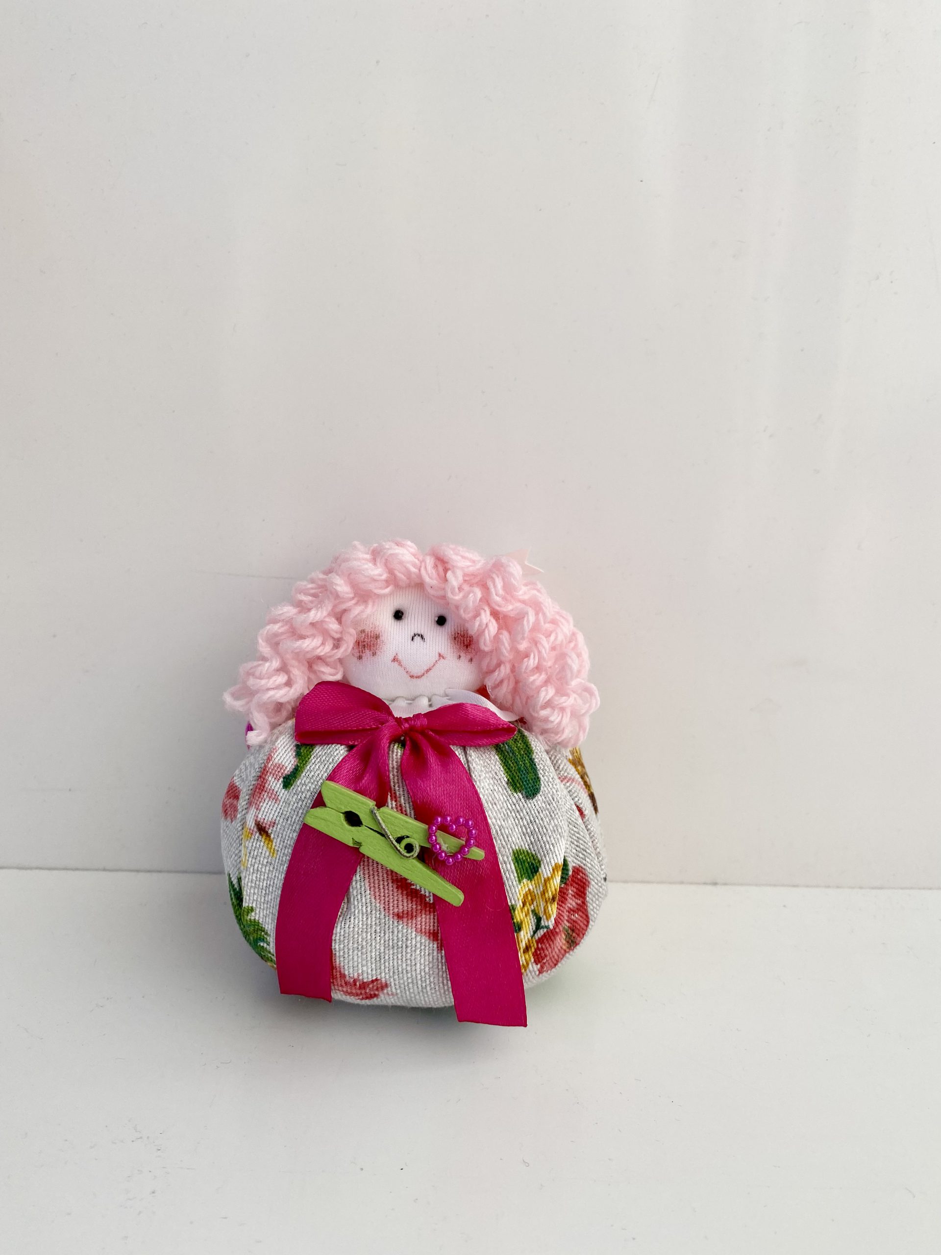 Velikost punčke je 10 cm, v celoti ročno izdelana in polnjena z aromatično sivko iz domačega vrta.